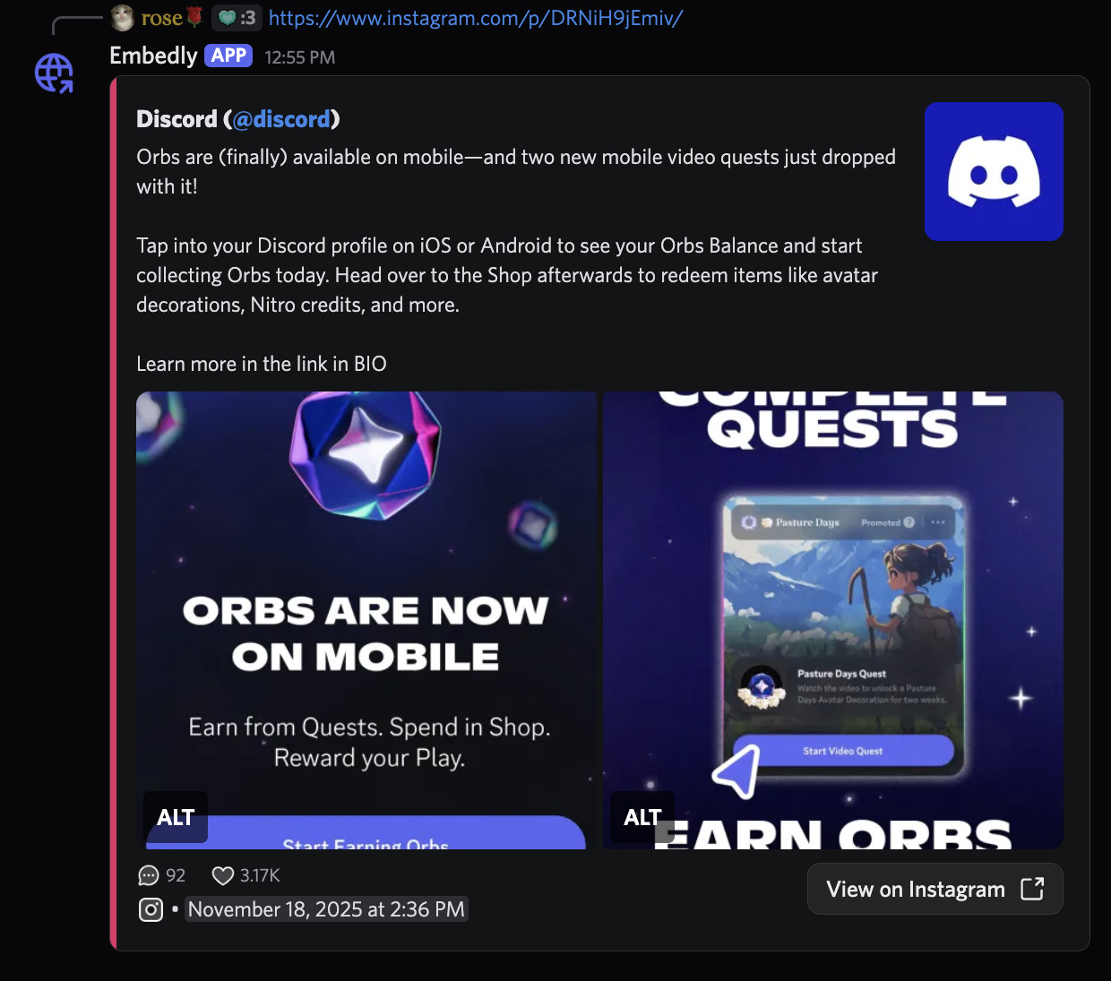 Embedly monitors messages in Discord servers where it's installed. When someone posts a supported social media link, the bot quickly processes it and posts a properly formatted embed with the full content - images, videos, captions, author info, everything.